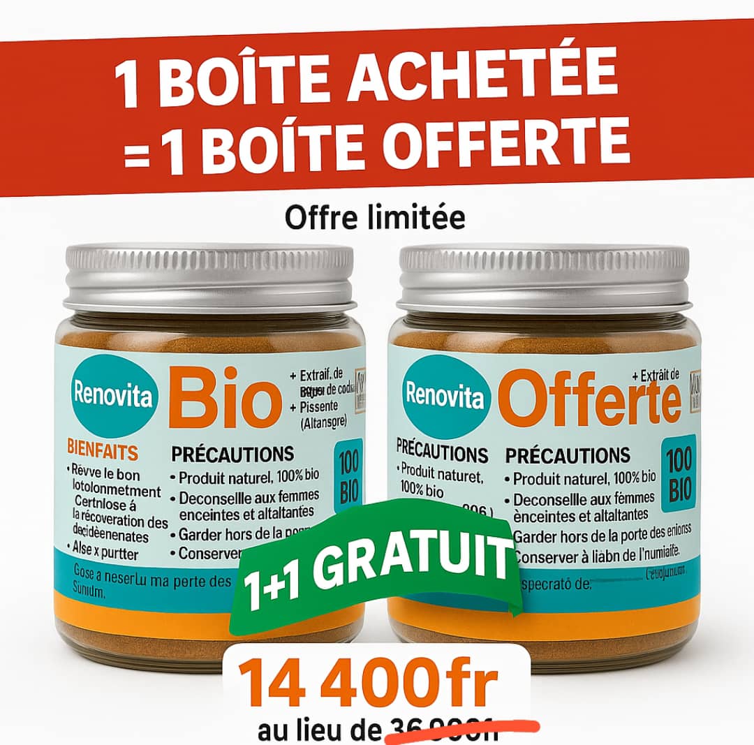 " J'ai décidé d'essayer Renovita Bio après avoir vu plusieurs avis positifs, et honnêtement je ne regrette pas ! Dès la première semaine, j'ai remarqué une. Mon corps se sent plus léger, je dors mieux et je n'ai plus ces douleurs persistantes. Aujourd'hui, je me sens en pleine forme et j'ai retrouvé mon énergie. Renovita Bio est devenu une partie de ma routine quotidienne. Merci pour ce produit naturel et vraiment efficace ! ."